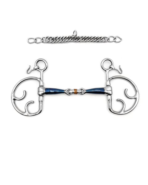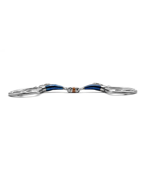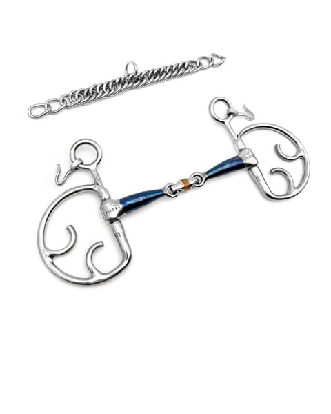 Sweet iron is a covering on top of a bit made of stainless steel. The purpose is to disguise the metal taste from stainless steel and create a pleasant, sweet taste, encouraging the horse to seek more contact and hold on to the bit. Following use, sweet iron will start to oxidize and turn brownish grey, which means that the bit will start to rust but this is to be expected.  The more the sweet iron oxidizes, more ‘sweet’ taste will be released. When this happens the ‘blue’ will almost disappear.